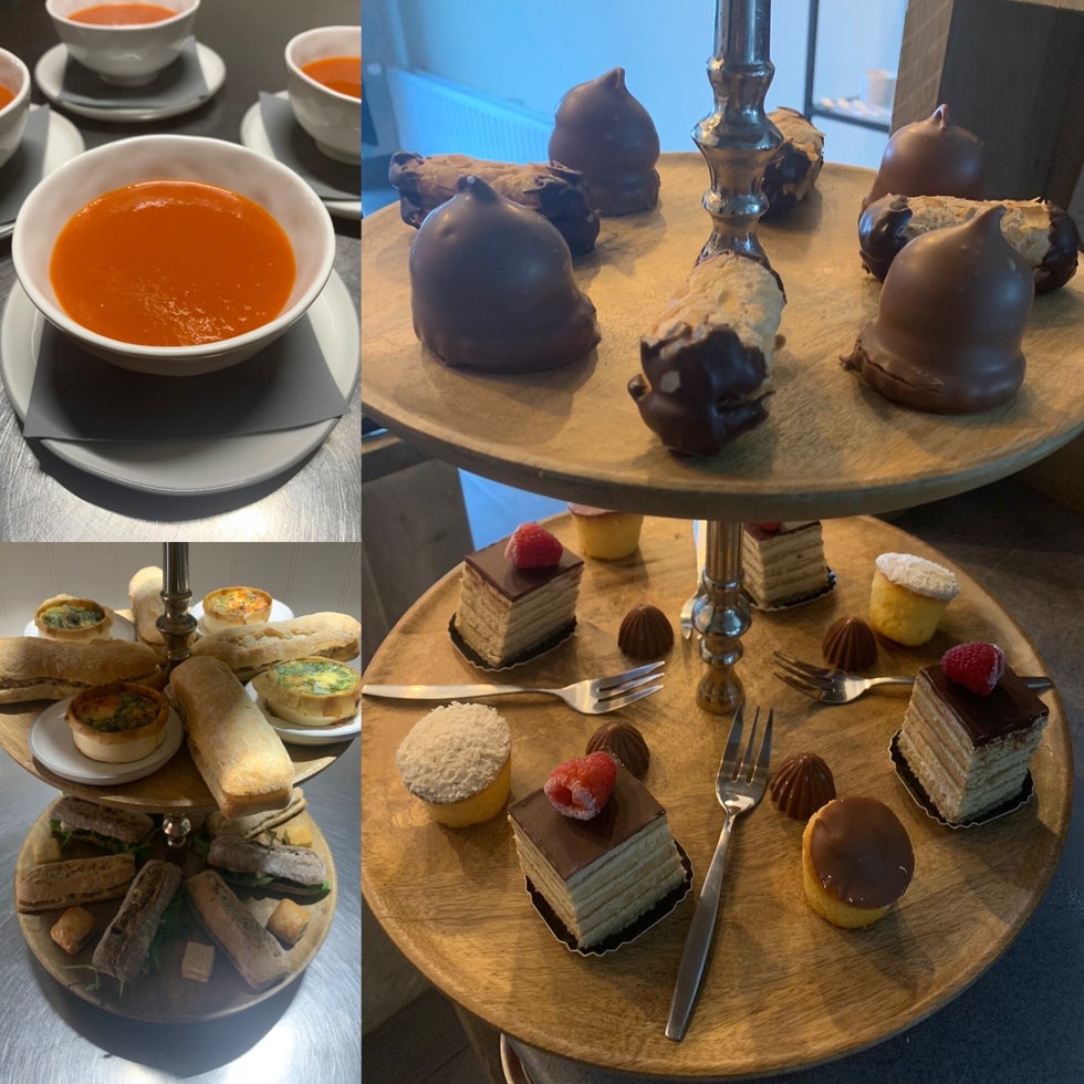 In onze High Tea zit een vers soepje, een heerlijk torentje gevuld met 3 hapjes, 3 kleine belegde broodjes (prepare, tonijnsalade en geitenkaas) en een verwenbordje met huisgemaakte lekkernijen en natuurlijk thee á volenté :-)